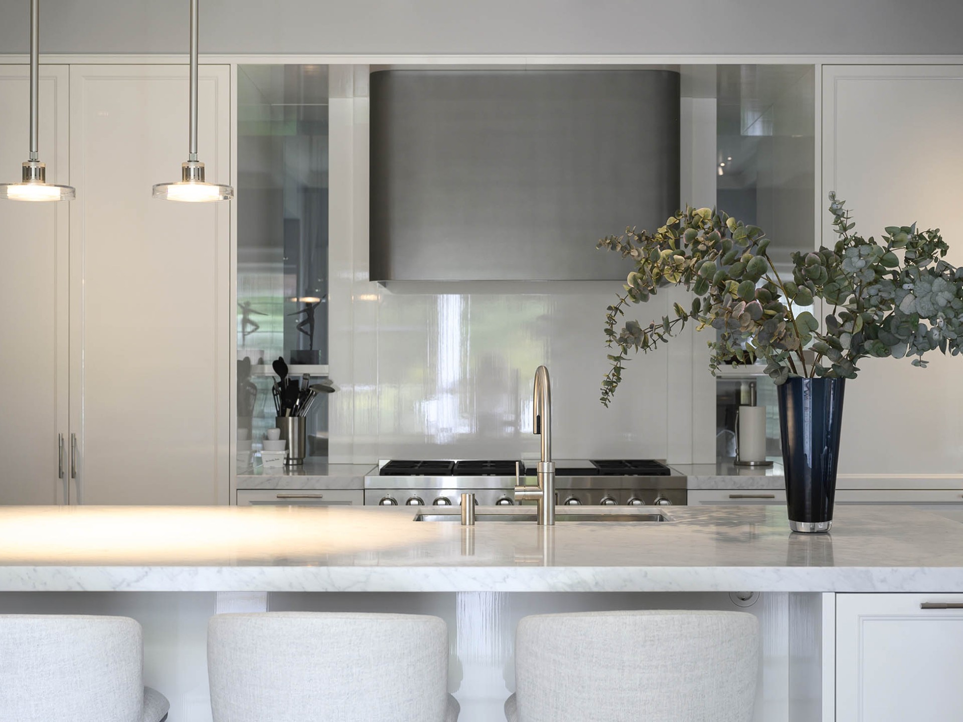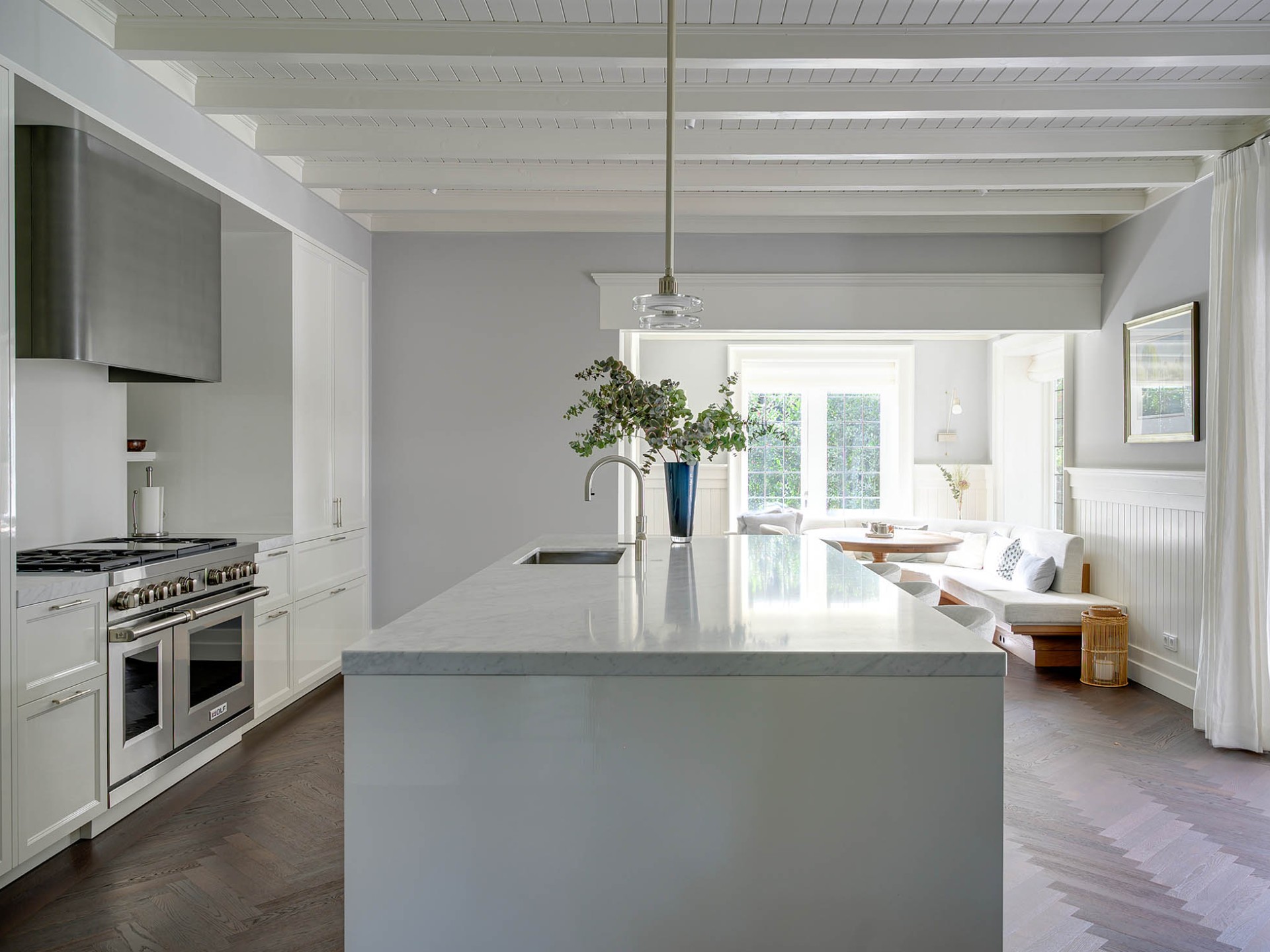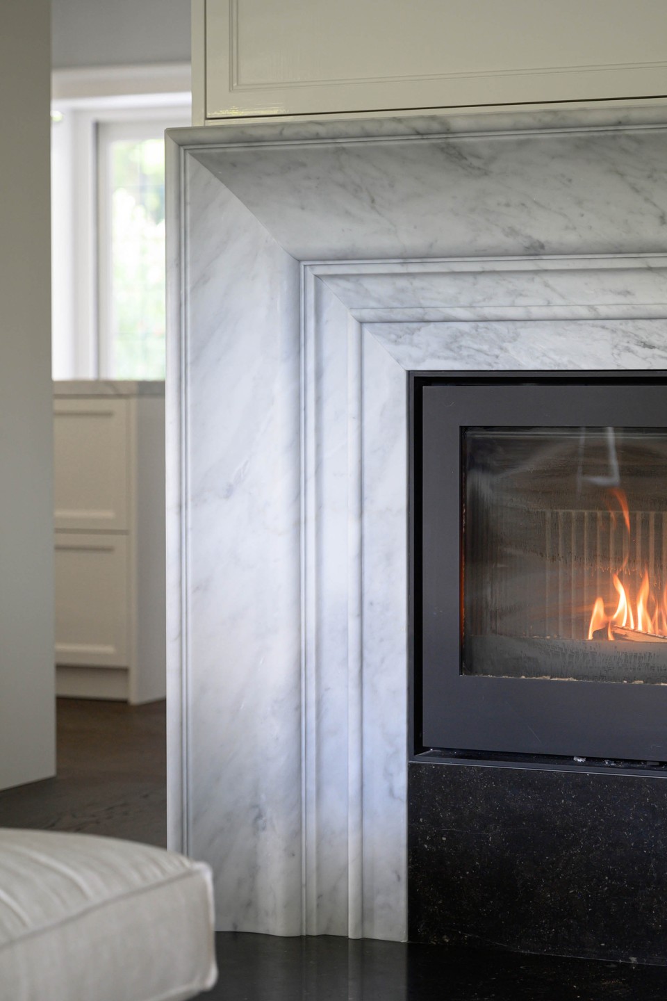 Eén en al vakwerk in deze Gooische woonvilla. Een functionele roomdivider welke is opgesteld in het midden van de ruimte, waardoor keuken en woonkamer gescheiden worden. Aan weerszijde van de afgeronde schouw is er een doorkijk doormiddel van glas gerealiseerd. De paneeldeuren zijn uitgevoerd in Lodder Standwit hoogglans strijklak en gecombineerd met het prachtige Bianco Cararra marmer. Een prachtige combinatie!
