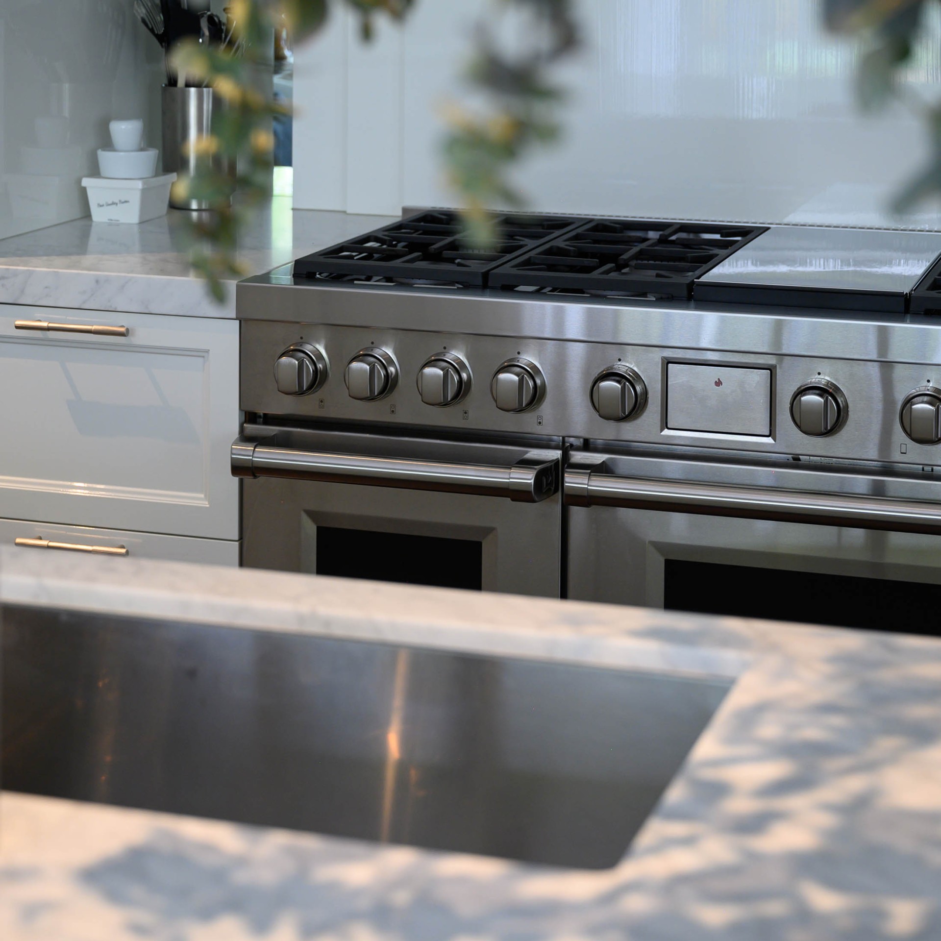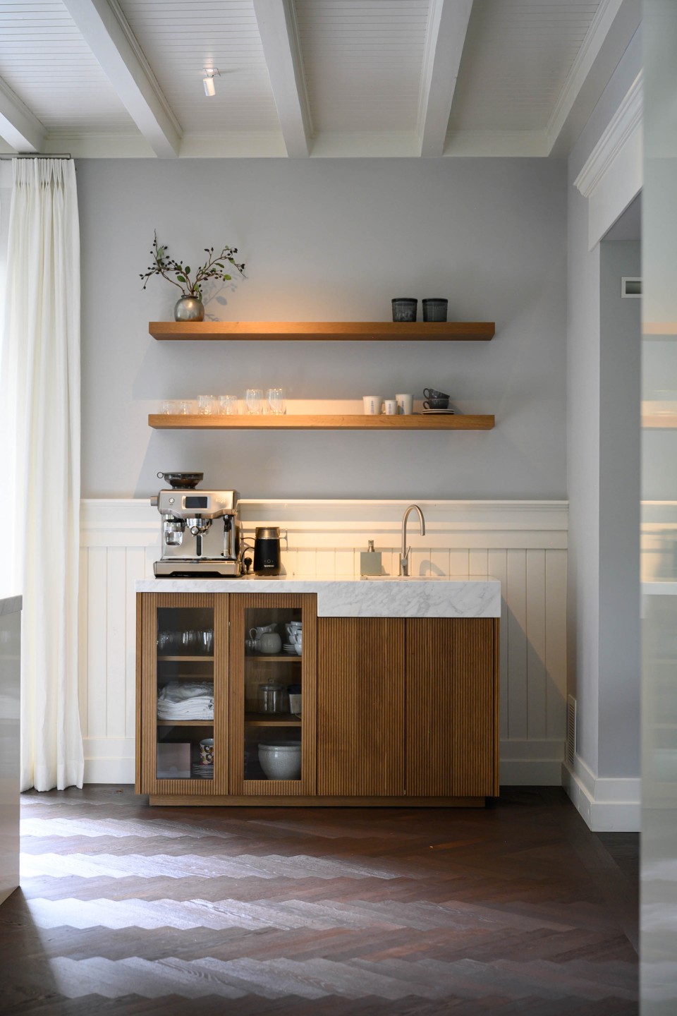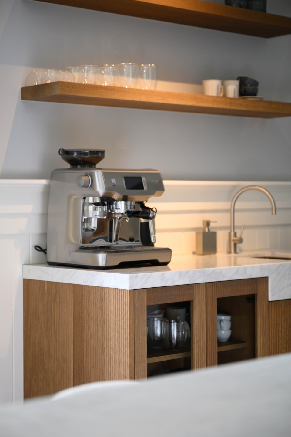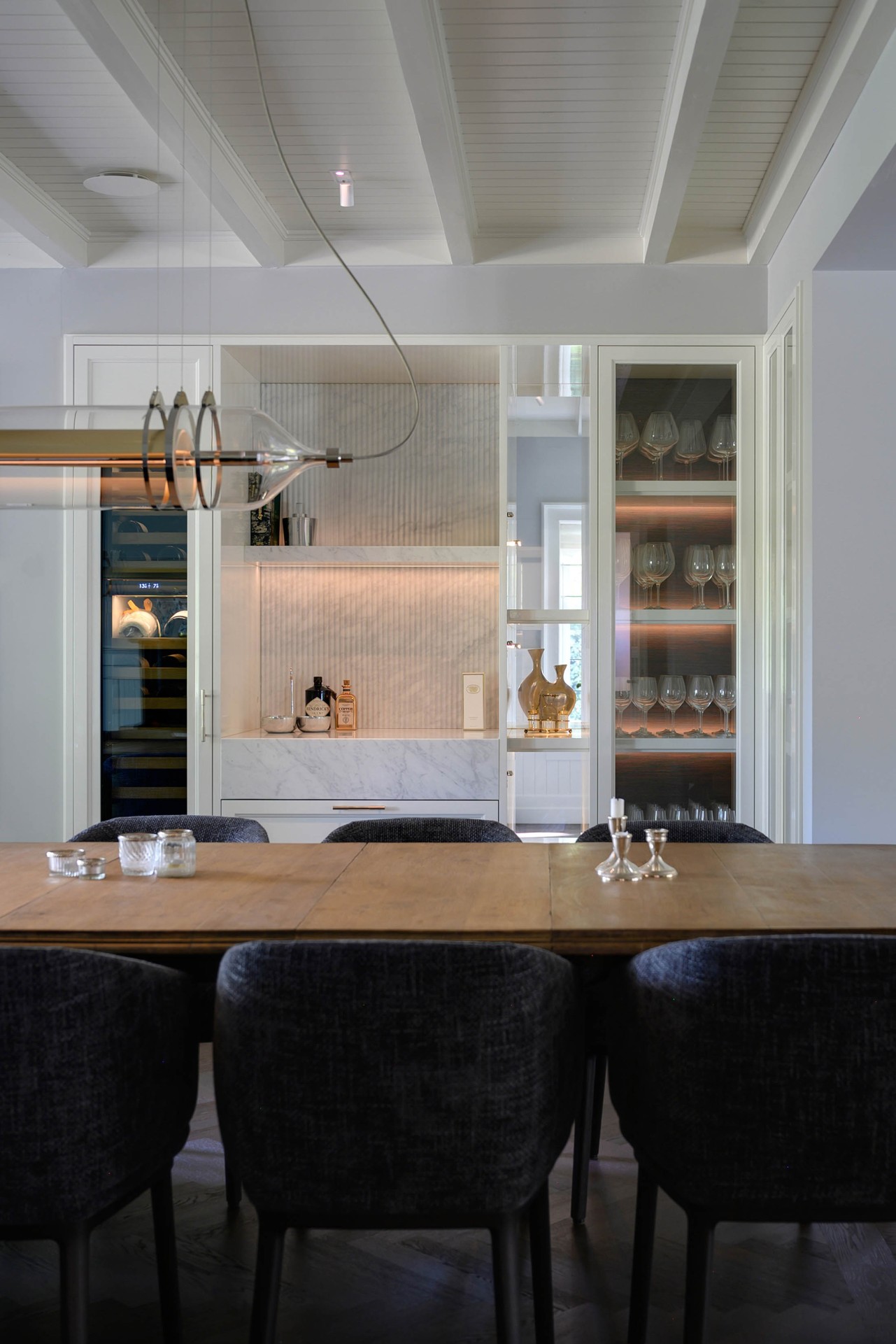 Eén en al vakwerk in deze Gooische woonvilla. Een functionele roomdivider welke is opgesteld in het midden van de ruimte, waardoor keuken en woonkamer gescheiden worden. Aan weerszijde van de afgeronde schouw is er een doorkijk doormiddel van glas gerealiseerd. De paneeldeuren zijn uitgevoerd in Lodder Standwit hoogglans strijklak en gecombineerd met het prachtige Bianco Cararra marmer. Een prachtige combinatie!