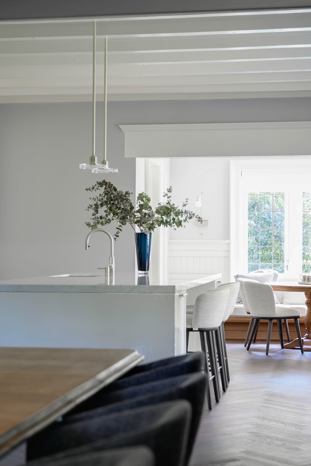 een monumentale villa middenin 't gooi, waar de keuken als middelpunt staat opgesteld en waar de subtiele lijnen doorlopen naar de woonkamer.
